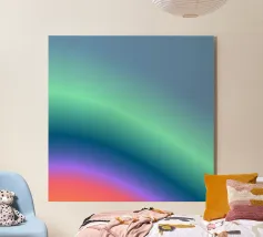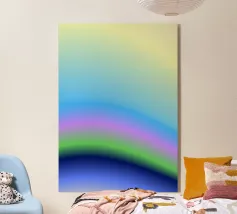 Questa delicata illustrazione mostra un arcobaleno in colori pastello con morbide sfumature di colore dall'azzurro al rosa, al giallo pastello e al verde chiaro. Le linee geometriche e le strisce strutturate danno un tocco moderno all'opera grafica e riflettono la natura. Un gioco armonioso di colori che irradia calma e gioia.