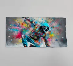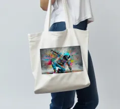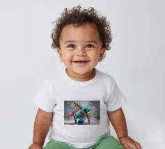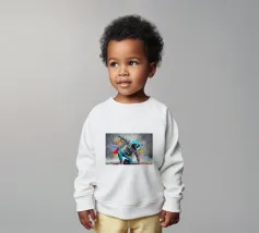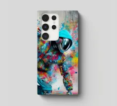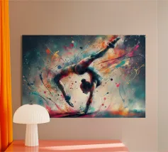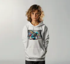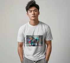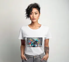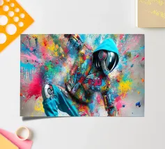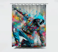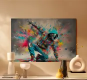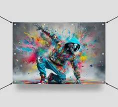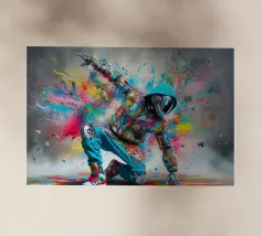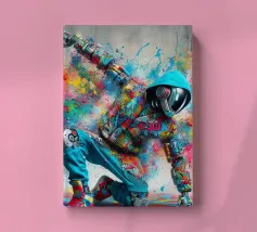Un'immagine dinamica e colorata di un robot in posa da breakdance, ricoperto da vivaci graffiti. Il robot indossa una felpa blu con cappuccio e presenta intricati dettagli meccanici sugli arti. Spruzzi di vernice rosa, gialla, blu e verde esplodono intorno alla figura su uno sfondo grigio strutturato. L'atmosfera generale è energica e urbana, con una forte influenza pop art.