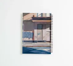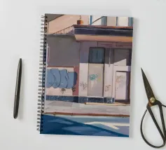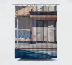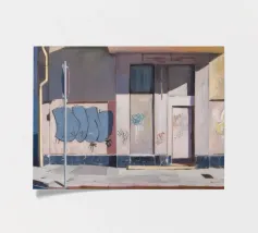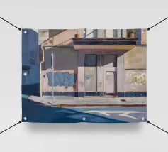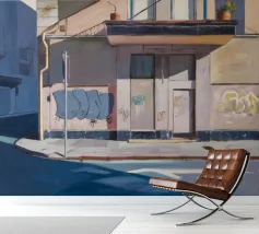 Il lato di un edificio, con una cassetta dei servizi ricoperta di graffiti, è definito da ombre nette e diagonali. Questo paesaggio urbano cattura la bellezza grintosa e l'arte transitoria della città con un forte senso della luce e della forma.