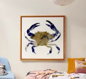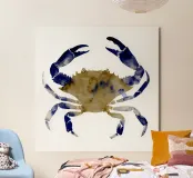 Questa audace illustrazione di granchio ad acquerello mostra chele di colore blu intenso in contrasto con un caldo guscio color sabbia. Il design minimalista conferisce un tocco di fascino rustico e di raffinatezza costiera, ideale per interni ispirati alla spiaggia o per decorazioni a tema nautico.