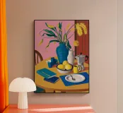 A still life featuring a bouquet of wheat stalks in a blue vase, a white pitcher, and lemons on a book. The composition on a blue table against a pink wall is rustic, warm, and beautifully balanced.