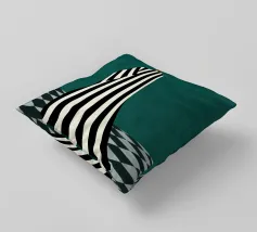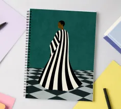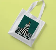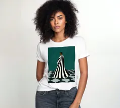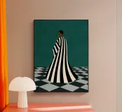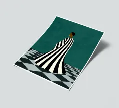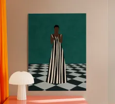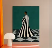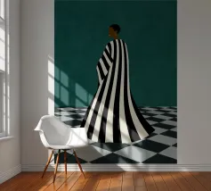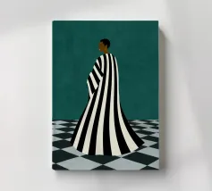 Un'opera d'arte minimalista di grande impatto, con una figura in un audace abito a righe bianche e nere in piedi su un pavimento a scacchi. Crea un senso di mistero e introspezione. Un mix perfetto di moda moderna, simbolismo astratto ed elegante contrasto per gli spazi contemporanei.
