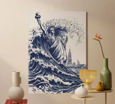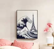 L'immagine raffigura un'illustrazione stilizzata in bianco e nero della Grande Onda al largo di Kanagawa, una famosa xilografia giapponese, con la Torre Eiffel sovrapposta all'onda. L'onda è raffigurata in un movimento dinamico e vorticoso, con creste spumeggianti e una base blu intenso. La Torre Eiffel si erge alta e slanciata, con la sua struttura intricata che contrasta con la forma organica dell'onda.