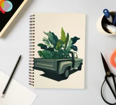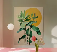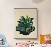 Un'illustrazione minimalista e pittorica di un camioncino vintage che trasporta una rigogliosa composizione di foglie tropicali sovradimensionate. Realizzata con tonalità tenui di verde e morbidi colori neutri, la composizione fonde la calma energia naturale con la forma industriale nostalgica. L'ampio spazio negativo e le morbide texture pennellate conferiscono all'opera d'arte un'atmosfera serena e moderna, ideale per interni contemporanei che privilegiano l'equilibrio, il movimento tranquillo e un sottile legame con la natura.