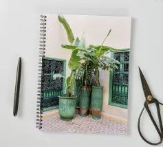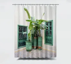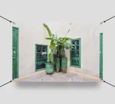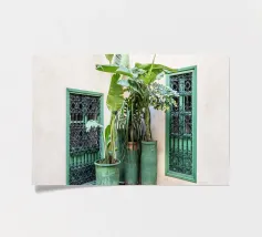 Green doors, green pottery, green plants. Botanical scenery in Morocco.
