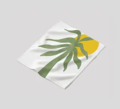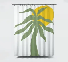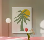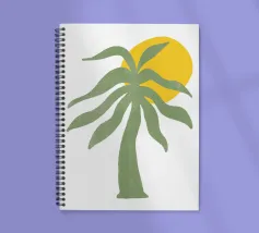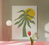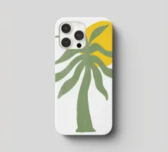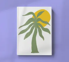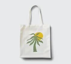 Una palma verde stilizzata si staglia contro un sole giallo brillante su un semplice sfondo bianco. Il design ha un'estetica semplice e moderna.