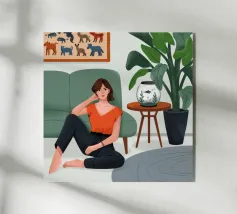 An illustration of a woman reading a book on a comfortable green sofa in a room with a gallery wall. The scene is a cozy, stylish, and perfect depiction of a quiet, literary escape at home.