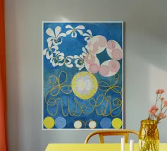 Gruppo IV, No. 1. I dieci più grandi, l'infanzia (1907) - Hilma af Klint Childhood è il primo dipinto della serie monumentale The Ten Largest di Hilma af Klint, creata nel 1907 come parte della sua innovativa esplorazione del ciclo della vita umana. Questa opera, imponente in scala e ricca di forme simboliche, rappresenta la prima fase della vita. La composizione è piena di spirali giocose, forme simili a semi, pastelli morbidi e modelli organici fluenti che suggeriscono innocenza, curiosità e l'inizio della crescita. Af Klint mescola l'astrazione con il simbolismo spirituale, utilizzando lettere fluttuanti, motivi botanici e un'immagine di un'opera che non ha nulla a che fare con la vita.