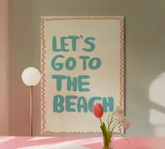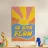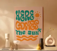Un motivo solare in stile anni '70: un sole giallo splende in alto con raggi caldi in rosa, arancione e giallo, mentre sotto scorrono onde blu, con la scritta "GO WITH THE FLOW" in un vibrante giallo vintage. Le linee curve e la ricca palette di colori trasmettono leggerezza e una sensazione di spensieratezza estiva. Ottimismo, libertà e relax: un mantra visivo che invita a godersi il momento e ad abbandonarsi al ritmo naturale.