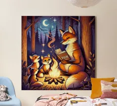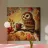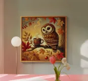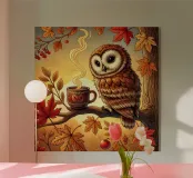 Un'affascinante illustrazione in stile cartoon di un gufo appollaiato con grazia su un ramo d'albero, circondato da vivaci foglie autunnali nelle calde tonalità del rosso, dell'arancio e dell'oro. Il gufo tiene in mano una tazza di sidro fumante, mentre la morbida luce dorata di un tranquillo tramonto illumina la scena. L'ambiente tranquillo e i dettagli stravaganti evocano l'accogliente bellezza dell'autunno.