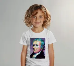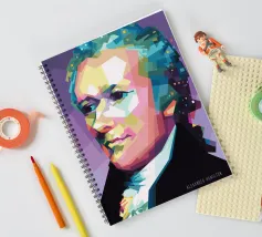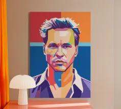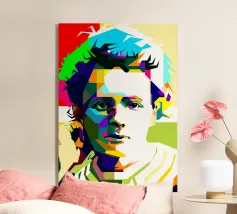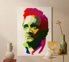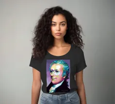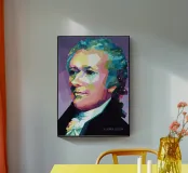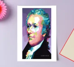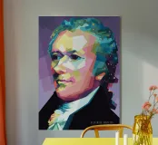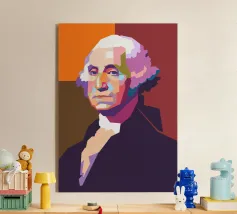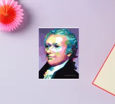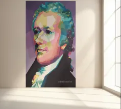 Alexander Hamilton in stile WPAP è illustrato utilizzando forme audaci e spigolose e colori vivaci e contrastanti che trasformano la sua immagine storica in una visione dinamica e moderna. Il disegno geometrico mette in risalto i suoi lineamenti affilati, i capelli incipriati e l'abbigliamento formale, fondendo l'eleganza classica con l'energia contemporanea della pop-art, a simboleggiare il suo impatto duraturo sulla storia americana.