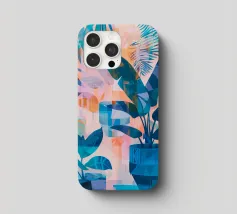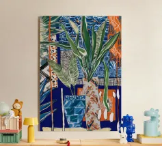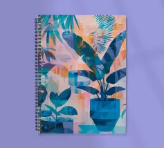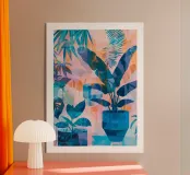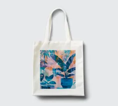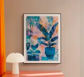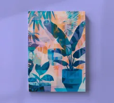 Illustrazione botanica colorata di piante tropicali in vaso, nei toni pastello del blu e dell'arancione. Questo disegno artistico gioca su sovrapposizioni e texture per creare una composizione vivace ed equilibrata. Con le sue foglie rigogliose e l'atmosfera tropicale, questa immagine è perfetta per iniettare freschezza e vitalità in uno spazio o in un progetto creativo. Un'opera moderna che celebra la bellezza della natura con un tocco contemporaneo ed elegante.