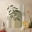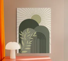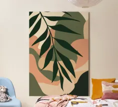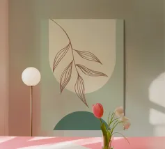 Un ramo di foglie si sovrappone a forme geometriche, tra cui linee arcuate e toni sfumati e stratificati. La combinazione crea un connubio armonioso tra natura e design astratto.