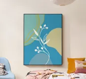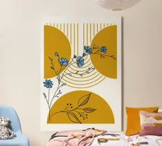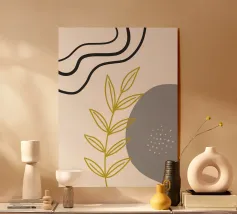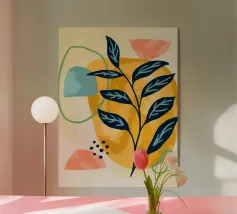 Un ramo stilizzato con foglie e bacche si staglia su uno sfondo astratto di forme blu, verdi e gialle. Le forme fluide e le morbide sfumature di colore danno un senso di armonia e di calma.
