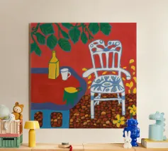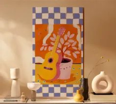 Una chitarra acustica poggia su una sedia rossa accanto a un pavimento a scacchi, invitando a raccontare storie in suono e solitudine.