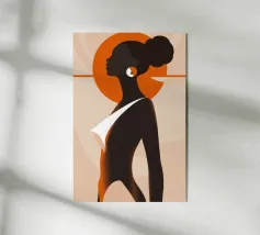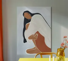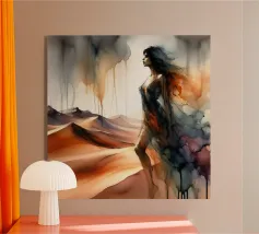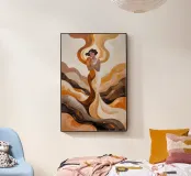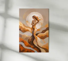 Una donna è raffigurata in morbide onde ondeggianti di tonalità dorate e terrose, che incarnano fluidità e tranquillità. La sua espressione è di dolce contemplazione, mentre si abbraccia in un momento di profonda riflessione. Lo sfondo si integra perfettamente con le sue forme, simboleggiando l'interconnessione tra le emozioni umane e la natura. Le pennellate calde e delicate creano una sinfonia visiva che evoca un senso di benessere e di appartenenza. Questo dipinto celebra la forza e la sensibilità della femminilità, fondendo l'astrazione moderna con una profondità emotiva senza tempo.
