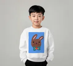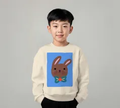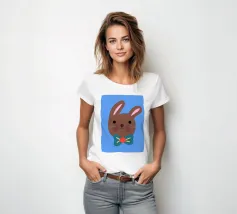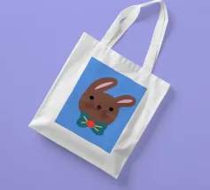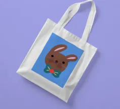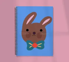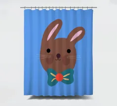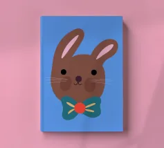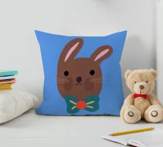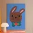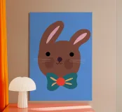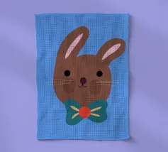 Simpatico coniglietto con grande fiocco. Coniglietto marrone con fiocco verde scuro su sfondo blu.