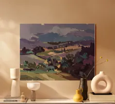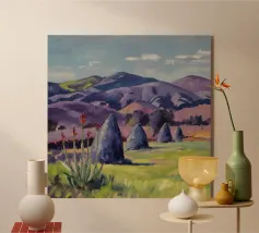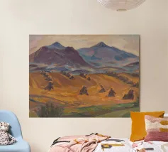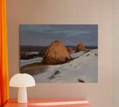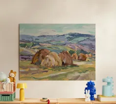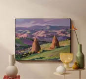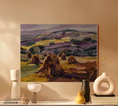 A serene landscape centered on a well-formed haystack standing in a field characterized by gently rolling hills in muted shades of purple and green, all under a soft, calm sky.