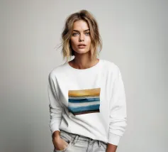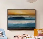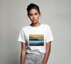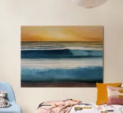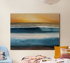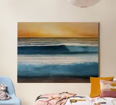 Un acquerello rilassante di onde che si muovono sotto un cielo dorato. Il sottile contrasto tra la luce calda e le tonalità fredde dell'oceano cattura la tranquilla magia di un paesaggio marino pacifico. Ideale per gli amanti dell'arredamento costiero e degli interni moderni e naturali.