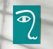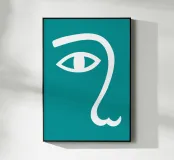 Il design minimalista è caratterizzato dall'interpretazione stilizzata di un occhio e di un naso. L'uso di linee bianche su uno sfondo verde acqua crea un look audace e moderno.