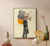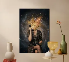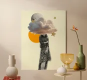 Questa surreale opera d'arte a collage presenta una donna in stile vintage la cui testa è sostituita da una soffice nuvola, circondata da stelle scintillanti e da una luna luminosa sullo sfondo. La tavolozza di colori tenui, combinata con accenti audaci come la forma del sole arancione, crea un'atmosfera stravagante e sognante. Perfetto per gli appassionati di surrealismo retrò, di arte celeste e di decorazioni murali introspettive con un tocco poetico.