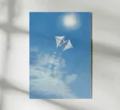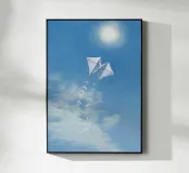 Un'illustrazione sognante e piena di luce di due aquiloni bianchi che si librano in un cielo azzurro, con delicate code di nastro che scivolano vicino al sole splendente. Con una texture pastello e una tavolozza pacifica, quest'opera d'arte cattura l'essenza della libertà, della nostalgia e della gioia tranquilla. Perfetto per asili nido, spazi ariosi e per chiunque sia attratto da scene di serenità edificanti e minimaliste.