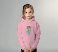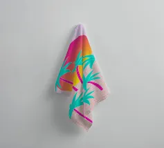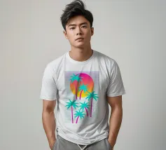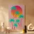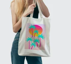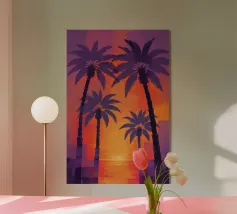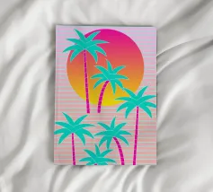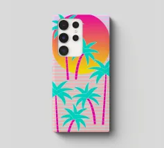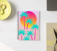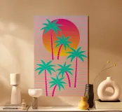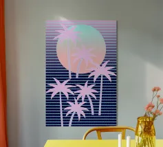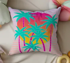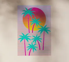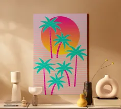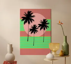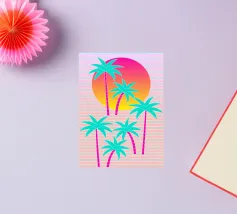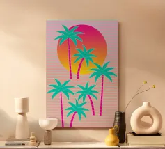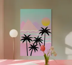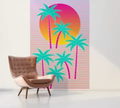 Spiaggia tropicale colorata e retrò in stile Miami, con palme vivaci di colore verde acqua e rosa, un sole sfumato giallo e rosa e sottili strisce verde menta, su uno sfondo color pesca arrossato.