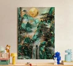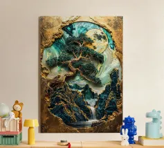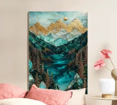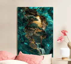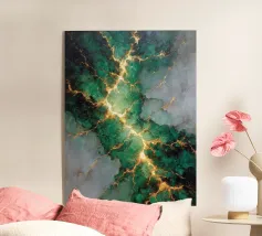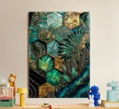 Le piastrelle esagonali di smeraldo, giada e ossidiana, ornate da volute di marmo e botaniche in foglia d'oro, creano un mosaico di splendore organico. La ricca texture, arricchita da cuciture dorate di ispirazione kintsugi, pulsa di rinnovamento, incorniciata dall'elegante griglia dell'esagono.