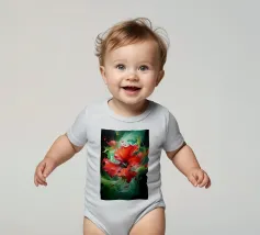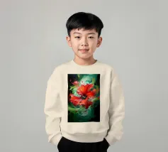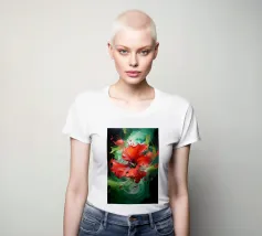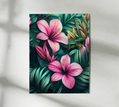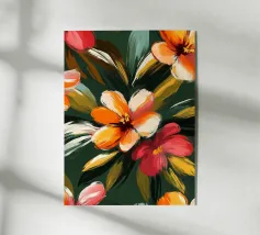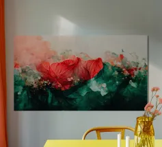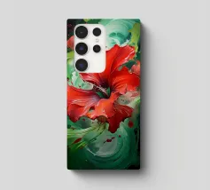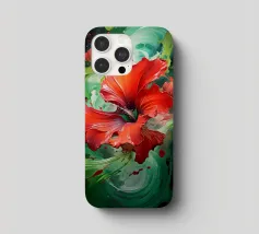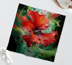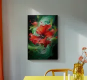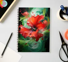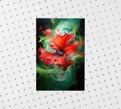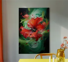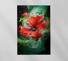 Un'opera d'arte digitale straordinaria presenta un fiore di ibisco rosso vivo circondato da spruzzi dinamici di vernice verde e gialla. Il movimento vorticoso e le texture fluide creano una composizione artistica ed energica che unisce la natura all'espressionismo astratto.