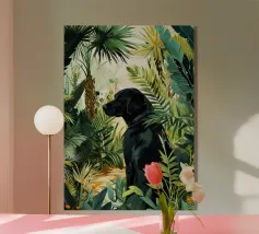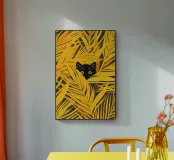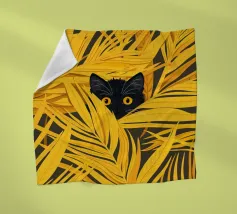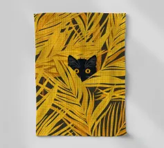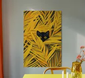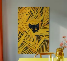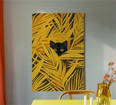 Hidden in Gold cattura un momento di giocosa quiete, in cui un piccolo gatto nero fa capolino da un mare di foglie dorate. L'audace contrasto tra il nero profondo della pelliccia e il giallo luminoso crea un ritmo visivo sorprendente, bilanciando la curiosità con la calma. La composizione è allo stesso tempo grafica e intima: il fogliame circostante incornicia il gatto come un bozzolo protettivo, suggerendo temi di riparo, osservazione e tranquilla meraviglia. Minimale ma espressiva, l'opera invita lo spettatore a soffermarsi e a scoprire la bellezza nei dettagli più sottili.