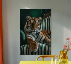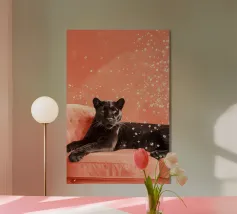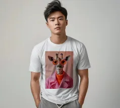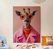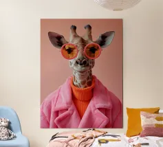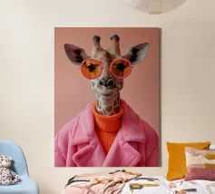 Un ritratto surreale ma elegante di una giraffa vestita in modo audace: un cappotto di pelliccia sintetica rosa, un vivace dolcevita arancione e occhiali da sole retrò oversize. Questa opera d'arte antropomorfa combina umorismo, eleganza e moderno surrealismo pop, creando un pezzo giocoso ma sofisticato. Ideale per interni eclettici, studi creativi o pareti di gallerie, questa stampa conferisce personalità, colore e un tocco di moda assurda a qualsiasi spazio.