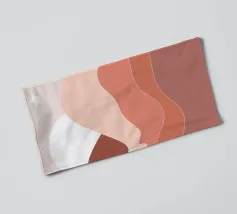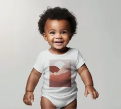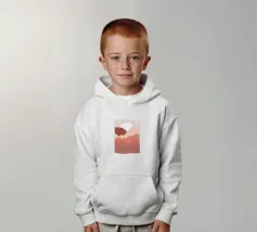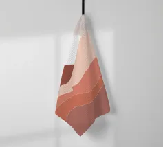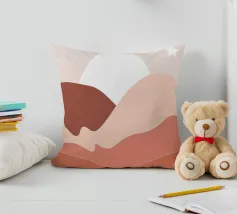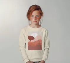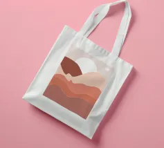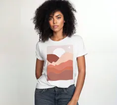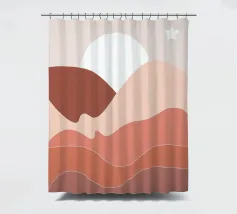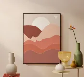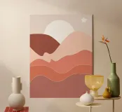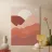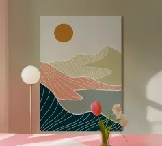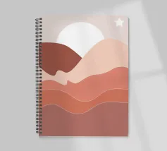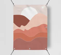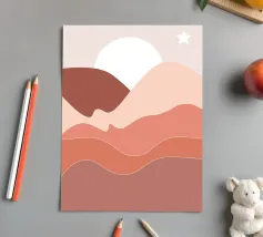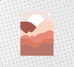 Strati curvi nei caldi toni della terra formano colline astratte sotto un grande sole e un'unica stella bianca. I colori si fondono dolcemente, creando un paesaggio sereno e minimalista.