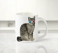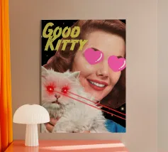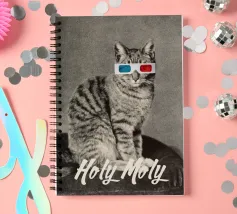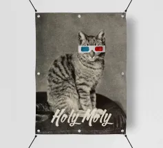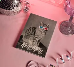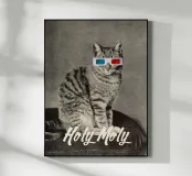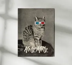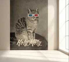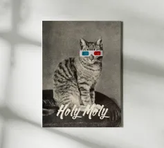 Stravagante ritratto di gatto in bianco e nero con un tocco di classe: questo felino vintage sfoggia occhiali 3D retro rosso e blu e la didascalia in grassetto "Holy Moly". Una stampa murale stravagante e umoristica, perfetta per gli amanti dei gatti, per gli appassionati di pop art retrò e per tutti coloro che amano un arredamento giocoso e capace di stimolare la conversazione. Divertente collage di gatti vintage di MsGonzalez