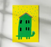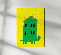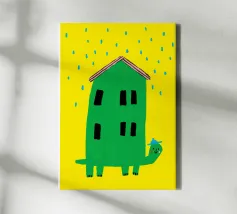 Simpatica tartaruga con una grande casa verde sotto la pioggia.