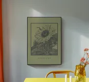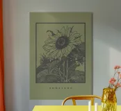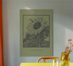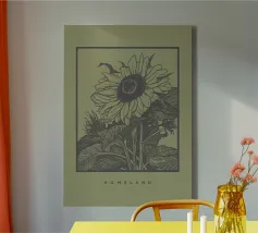 Descrizione del prodotto: Questo disegno artistico presenta un'illustrazione dettagliata di un girasole incorniciato da una cornice nera rettangolare su uno sfondo verde tenue e pastello. Le linee disegnate a mano e il delicato tratteggio conferiscono all'illustrazione uno stile classico e senza tempo. Sotto il motivo è presente la scritta minimalista "HOMELAND", che sottolinea la sensazione di connessione e vicinanza alla natura. Dettagli: Motivo: Girasole disegnato a mano con foglie e fiori dettagliati.