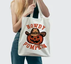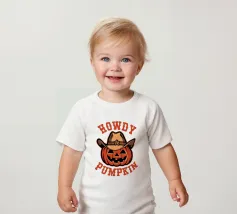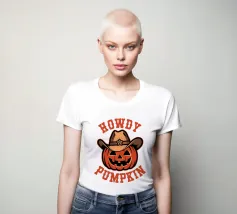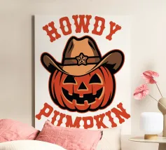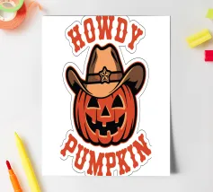 Un'allegra zucca indossa un cappello da cowboy, accompagnato dal testo scherzoso "Howdy Pumpkin". Il disegno combina i temi di Halloween e del western con un tocco giocoso.