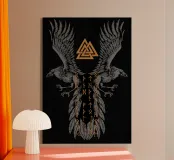 Un potente simbolo della mitologia norrena: due corvi dettagliati con le ali spiegate incorniciano il Valknut - antico simbolo di Odino - mentre misteriose rune scorrono sulle piume. La raffigurazione ad alto contrasto in nero e oro trasmette forza, saggezza e profondità spirituale. Ideale per gli appassionati di leggende nordiche, estetica vichinga o simbolismo spirituale. Questo motivo è particolarmente adatto a studi, spazi di lavoro o come parte di una collezione mistica.