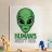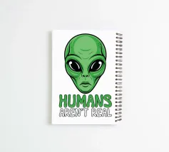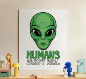 Un alieno verde con grandi occhi neri si staglia su uno sfondo verde scuro, accompagnato dal testo umoristico "Gli umani non sono reali".