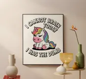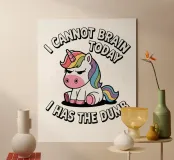 Un simpatico unicorno con una criniera arcobaleno siede circondato da stelle, accompagnato dal testo umoristico "Oggi non posso fare il cervello, ho il muto". L'immagine è collocata su uno sfondo semplice.