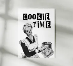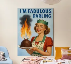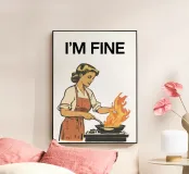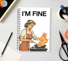 Una donna in stile retrò cucina su un fornello con una grande fiamma dalla padella, accompagnata dalla frase "I'M FINE" sopra di lei. L'immagine trasmette un senso di calma in mezzo al caos.