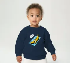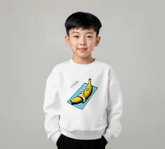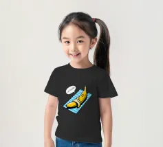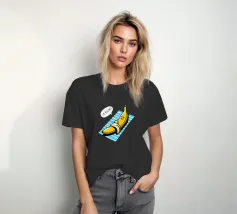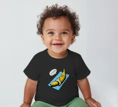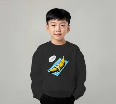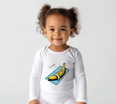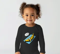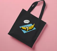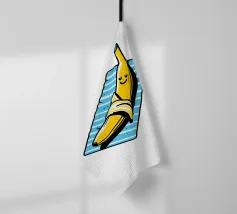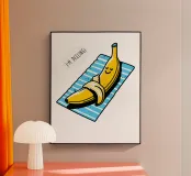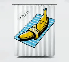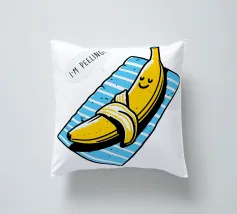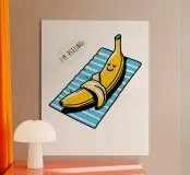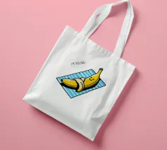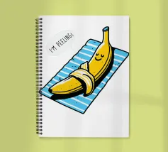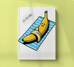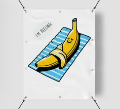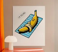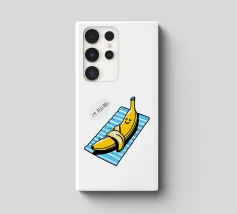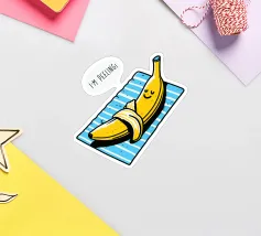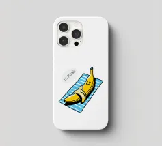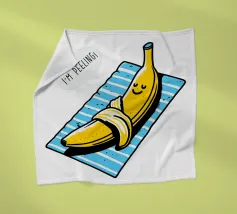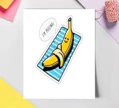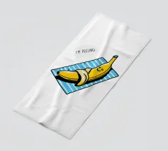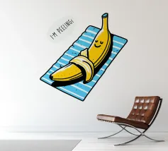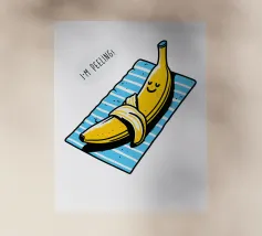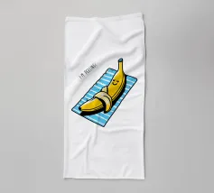 A cartoon banana lounges on a blue-striped towel, smiling with a speech bubble saying "I'm peeling." The playful scene combines humor and personification as the banana seemed to enjoy sunbathing.
