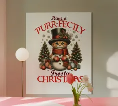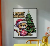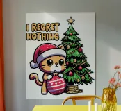 Un simpatico gatto con un cappello da Babbo Natale tiene in mano un ornamento natalizio accanto a un albero decorato. Il testo in grassetto sopra il gatto recita "I REGRET NOTHING", aggiungendo umorismo alla scena festiva.