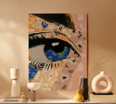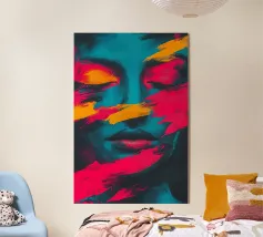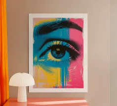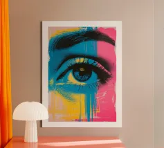 Questa vibrante e colorata illustrazione presenta un intenso occhio umano che si fonde con spruzzi di blu, giallo e rosa, creando un senso di energia e movimento. Le linee sottili del volto e dell'occhio sono contrastate da schizzi di pittura astratta, che conferiscono all'opera un aspetto contemporaneo e dinamico. Una scelta perfetta per aggiungere un tocco artistico audace e sorprendente al vostro spazio abitativo, mettendo in risalto l'espressione e l'emozione attraverso un colore vibrante.
