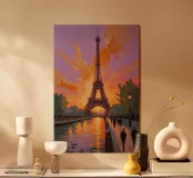 Questo dinamico dipinto impressionista raffigura la Torre Eiffel che risplende sotto un vibrante tramonto. Il gioco di luci e ombre crea una straordinaria gamma di colori, dal giallo oro al viola intenso. Le pennellate strutturate conferiscono profondità al cielo, mentre il riflesso scintillante del canale esalta l'armonia della composizione. Incorniciata da alberi e strade parigine, la torre rimane il fulcro, rappresentando il fascino senza tempo della capitale francese.