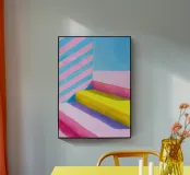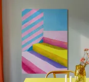 Illustrazione a guazzo di gradini gialli davanti a pareti a strisce rosa-blu-gialle. Sfondo minimalista, linee decise, forme geometriche e composizione chiara. Blocchi di colore vivaci in tonalità pastello di rosa, blu, giallo e bianco creano un'illustrazione astratta, vivace ed estetica.