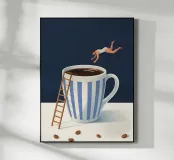 Un'audace immersione nel mondo del caffè: questa fantasiosa illustrazione cattura l'essenza del risveglio energico e amante della caffeina. La scena è al tempo stesso poetica e umoristica, e rievoca quel momento in cui il caffè diventa una vera e propria ancora di salvezza mattutina. Un'immagine originale, perfetta per gli appassionati di caffè, di arte surrealista e di evasione creativa. Aggiungete un tocco di energia e fantasia alla vostra casa.