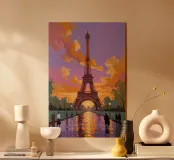 Questo vibrante dipinto a olio impressionista cattura la Torre Eiffel che si staglia su un tramonto ipnotico. Le striature di viola, arancio e oro dominano il cielo, con la loro ricca texture che aggiunge profondità ed emozione alla scena. In basso, il riflesso della torre luccica sui sentieri bagnati, creando un senso di tranquillità. Le sagome dei pedoni passeggiano con disinvoltura, incarnando la tranquilla atmosfera parigina. Il gioco di luci e ombre sulla torre e sugli alberi racchiude perfettamente il fascino iconico di Parigi al tramonto.