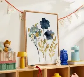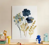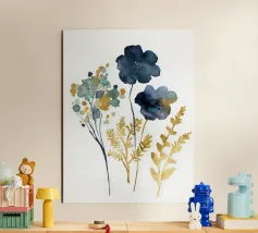 Una composizione botanica minimalista che bilancia le ricche fioriture indaco con il caldo fogliame ocra e i morbidi boccioli astratti. Questo pezzo unisce l'eleganza alla sobrietà, perfetto per gli spazi che privilegiano il design ponderato, il contrasto e un'estetica naturale moderna.