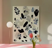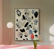 A light, modern botanical abstraction made of soft indigo washes and crisp navy silhouettes. The floating shapes—some cloudlike, some leaf-inspired—create an elegant sense of movement across a bright, minimal background. The mix of delicate watercolor textures and bold graphic forms gives the piece a balanced, airy feel. Perfect for contemporary, Scandinavian, or spa-inspired interiors, this artwork brings calm, freshness, and a touch of natural rhythm to any space.