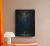 Un astronauta solitario si trova in una pianura scarsamente illuminata e osserva un vasto cielo notturno scintillante. Le pennellate ricche e strutturate catturano le dimensioni impressionanti del cosmo, evocando i temi della meraviglia, dell'esplorazione e del desiderio umano di andare oltre il nostro mondo.